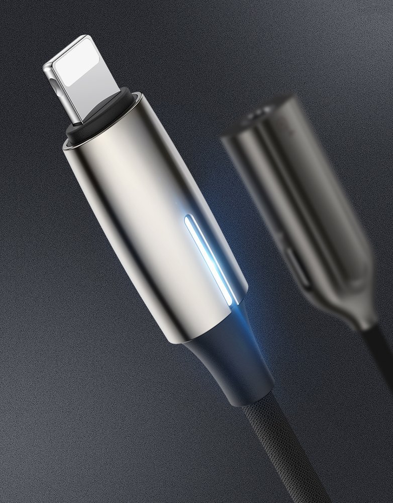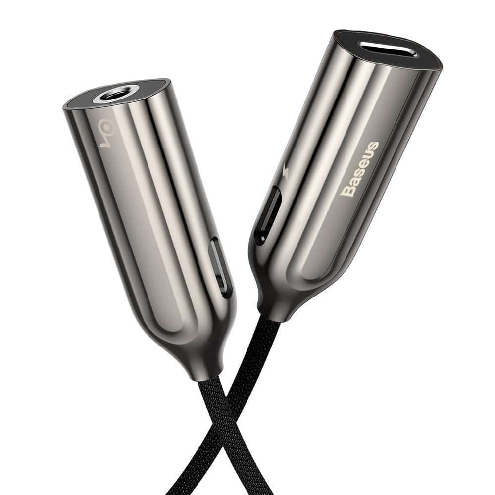 Baseus átalakító adapter kábel Lightning csatlakozós készülékekhez. A kimenetén egy Lightning aljzat van a töltéshez valamint egy 3.5mm-es jack audio aljzat a fülhallgató számára.