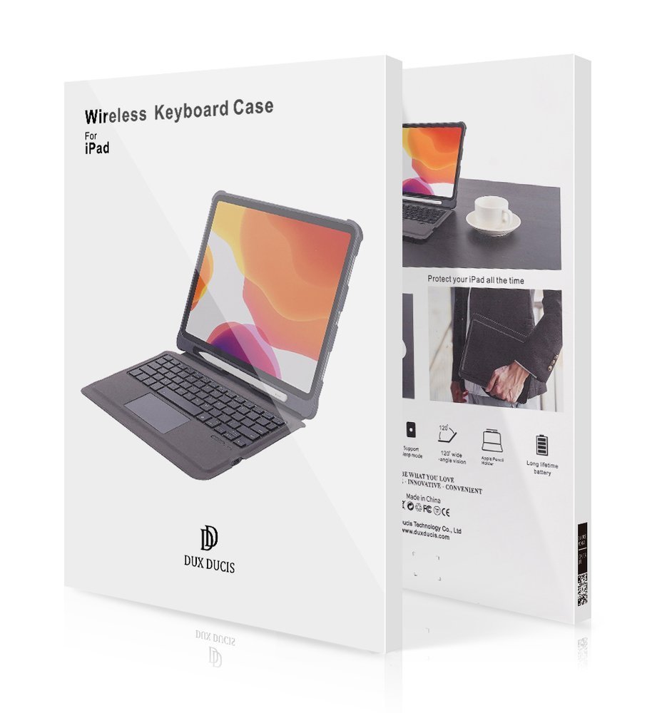 Billentyűzet védővel ellátott iPad tok ami használható a készülék állványaként is. A billentyűzet 100 órán át képes megszakítás nélkül dolgozni, miután teljesen feltöltődött. Minőségi PC-ből készül, piszok- és karcolásálló bőrből.