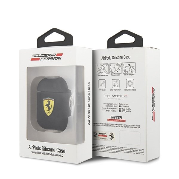 Ferrari szilikon tartó. A szilikon tok védi az AirPods vezeték nélküli fejhallgató-dokkolót a felületi sérüléstől és az esetleges elvesztéstől. A kiváló minőségű szilikon tok tökéletesen megfelel az eredeti AirPods toknak, és rendkívül kellemes tapintású. A tok oldalán található egy praktikus gyűrű, amely lehetővé teszi például a zsinórra való rögzítését.