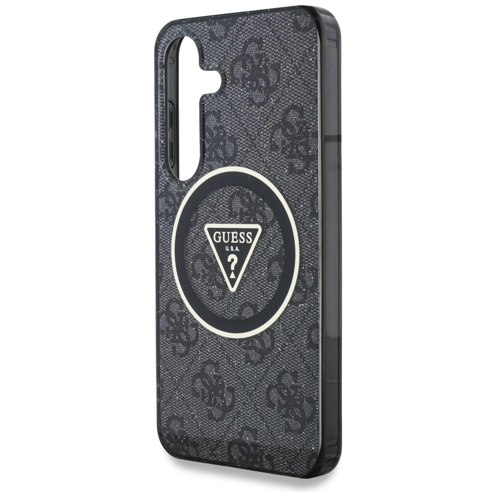 A Guess 4G Glitter Triangle fekete tok különleges választás Galaxy S25 készülékhez. Csillogó glitteres felület, háromszög logó és MagSafe-kompatibilitás — védelem stílusos csomagban. ✨📱