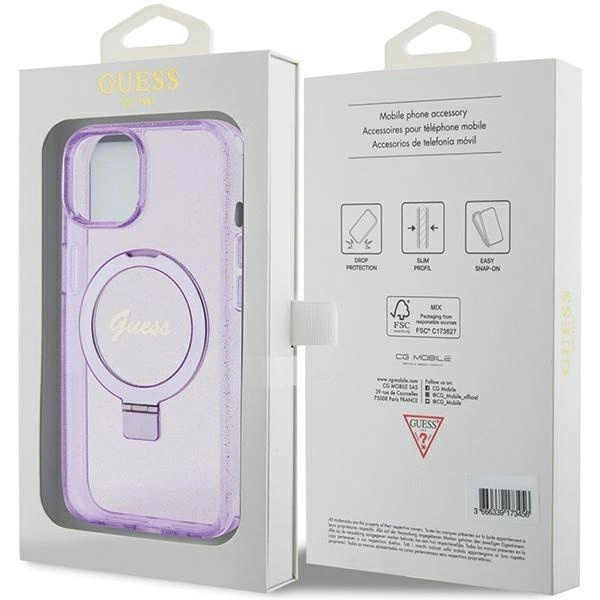 Guess Ring Stand Script Glitter MagSafe iPhone 15 telefontok (lila)