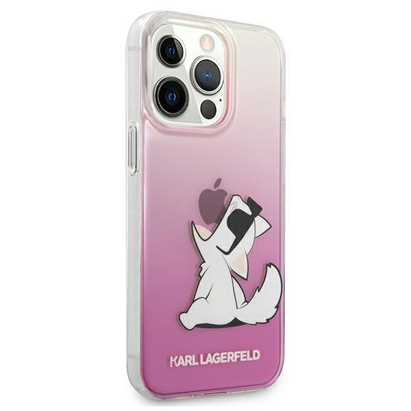 Átlátszó rózsaszín védőtok Karl Lagerfeld divattervező Choupette macskájának grafikájával iPhone 13 Pro Max telefonokhoz.