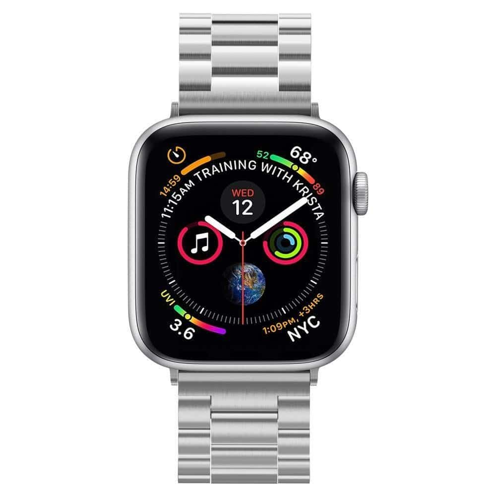 Spigen Modern Fit Band rozsdamentes ezüst fém Apple Watch óraszíj, 42/44/45mm méretű órákhoz. A csomag tartalmazza a láncszétszedő szerszámot is és tartalék láncszemeket is!