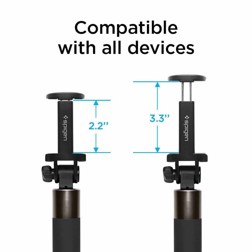 A Spigen selfie bottal minden telefon együtt tud dolgozni, amely fényképezővel és bluetooth kapcsolattal rendelkezik. Ma, amikor a csatlakozók évente cserélődnek a telefonokon a legjobb döntés és szabvány bluetooth csatlakozási képességgel rendelkező szelfi botba fektetni. Teljesen mindegy, hogy lightning csatlakozós iPhone, vagy USB C csatlakozós Samsung a készülékünk, a Spigen S530w bluetooth szelfibot mindegyikkel működni fog. Hosszúsága 18 és 80 cm között szabadon állítható a teleszkópos tartós alumínium rudazatnak köszönhetően.