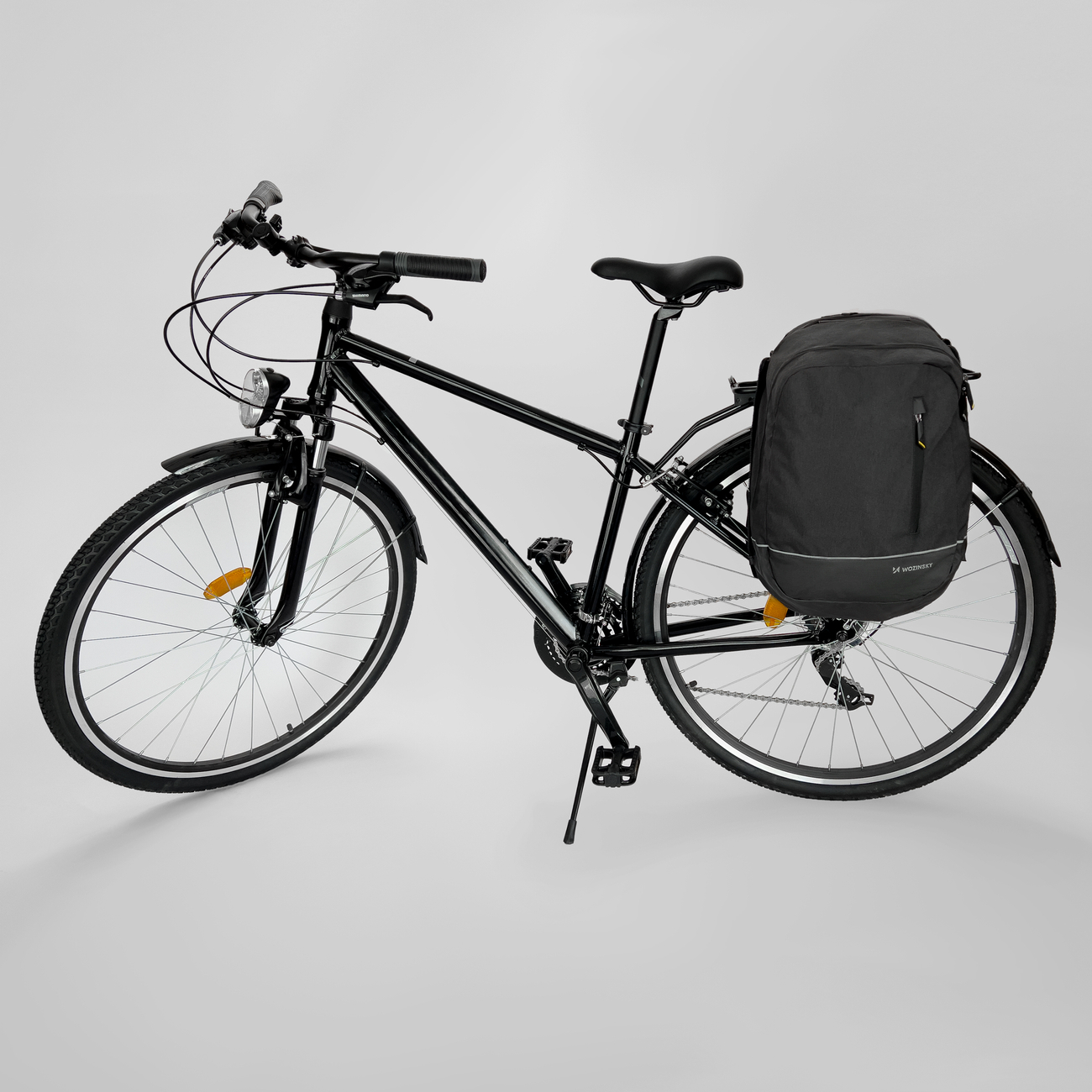 A Wozinsky WBB30BK dupla kerékpártáska könnyen átalakítható kényelmes, kétkarú hátizsákká. Mindössze ki kell húznia a fő cipzárt – belül speciális rögzítők találhatók, amelyek segítségével a táskát a csomagtartóhoz rögzítheti. Akassza az akasztókat a csomagtartóra, és rögzítse az alsó tépőzárat a keretre. Kész!